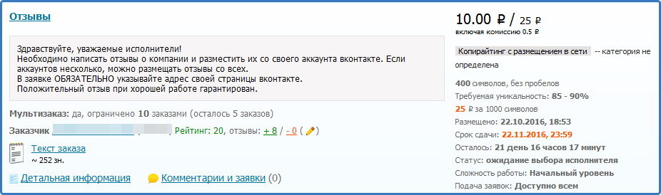 К написанию статей приступать страшно, хотя это наиболее выгодный заработок в интернете без вложений и обмана. А черкнуть небольшой комментарий или отзыв — пустяк. Зато сразу начинает возрастать рейтинг, заказчики оставляют приятные отзывы. Авторитет исполнителя растёт. Вместе с ним исчезает чувство страха, радуют цифры рейтинга, деньги прибывают. Душа ликует.