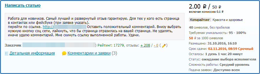 1. Заголовок внушительный «Написать статью». Но, прочтя ТЗ, выясняется, что заказчик просит оставить небольшой комментарий, нажать кнопку любой соц сети и разместить ссылку в своей ленте. Ясно, на чем можно быстро заработать. Жаль, стоимость не высока, но задание совсем простенькое.