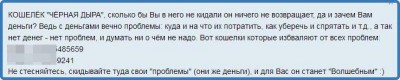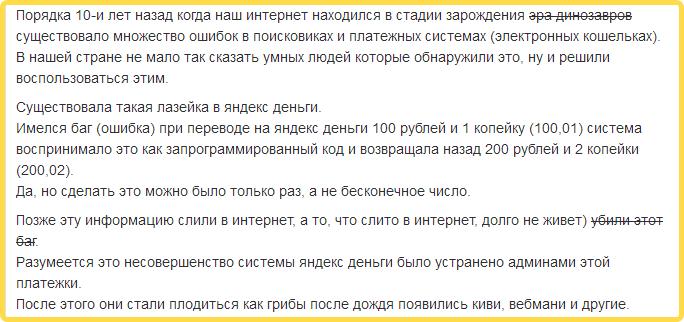 Желая получить Яндекс Деньги на халяву, люди отправляют крупные суммы, не получая взамен ничего. Волшебный кошелёк Яндекс Деньги (как и любой другой, Киви, Вебмани) — некий прототип хайп-проектов в интернете. Небольшие суммы первым участникам ещё отправляют, а с крупными поступлениями владельцы кошельков не спешат расставаться.