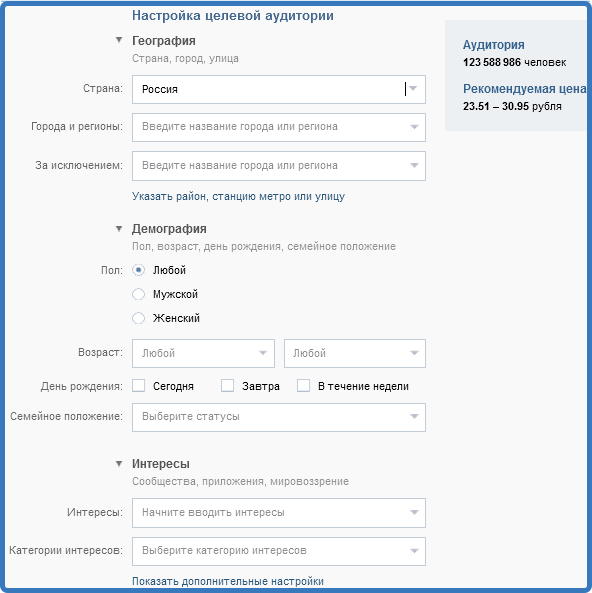 Указывают страну и регион, настраивают демографию. Нажав надпись «Показать дополнительные настройки», выбирают сообщества для показа и прочие данные.