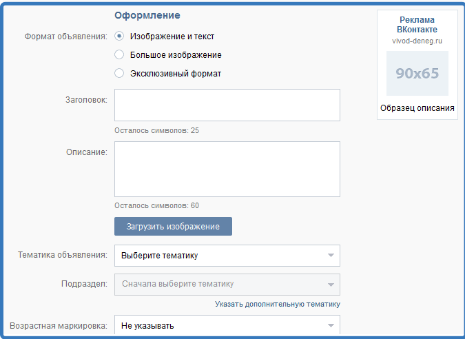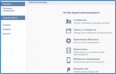 - Используют рекламные инструменты сервиса ВКонтакте. Выбирают тип рекламы, указывают, что именно рекламируется, и приступают к заполнению полей.