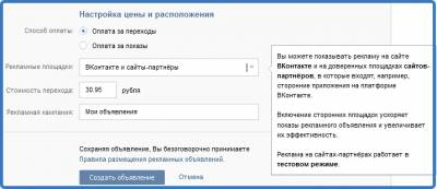 Тип оплаты — за переходы или показы. Указывают рекламные площадки. Помимо самого сервиса есть возможность показывать рекламные объявления на сайтах партнёров ВК. Придумывают название рекламной кампании, указывают стоимость перехода.